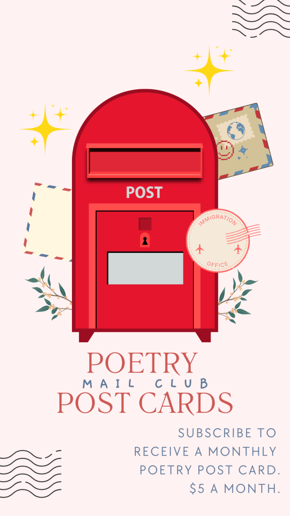 I hope you’ll consider joining my mail club. Your subscription fee covers the cost of printing the post cards, postage, and offers me a tiny portion towards my work as a poet, which allows me to prioritize my art and pursue growth.